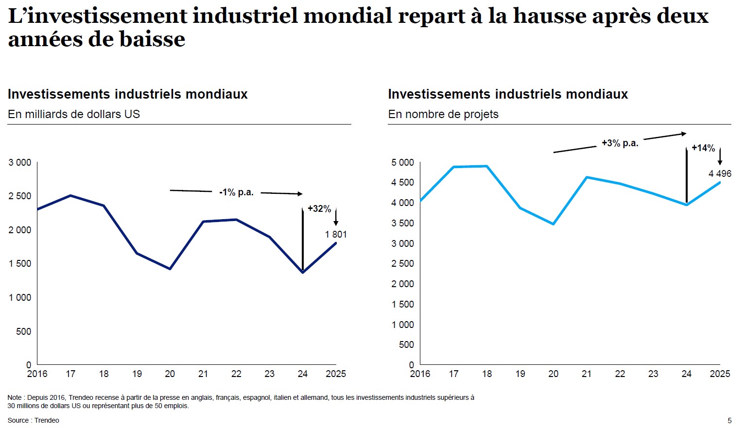 L’éditeur de données économiques Trendeo, le cabinet international de conseil en stratégie McKinsey & Company et l’école d’ingénieurs CESI dévoilent leur baromètre annuel mondial des investissements industriels. Après deux années de baisse, ces derniers repartent à la hausse en 2025, tant en nombre de projets qu’en montants investis (graphique 1 - ©Trendeo, comme pour tous). Une bonne nouvelle qui cache néanmoins d’importantes disparités, de profonds bouleversements, mais aussi une agréable surprise !